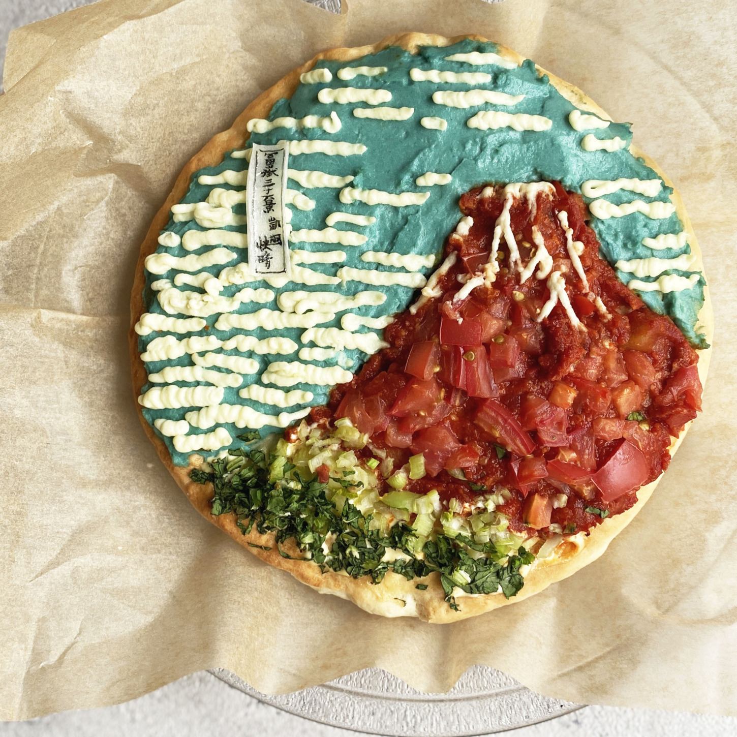 トマトをトッピングして山裾に散らしているのは小松菜です。