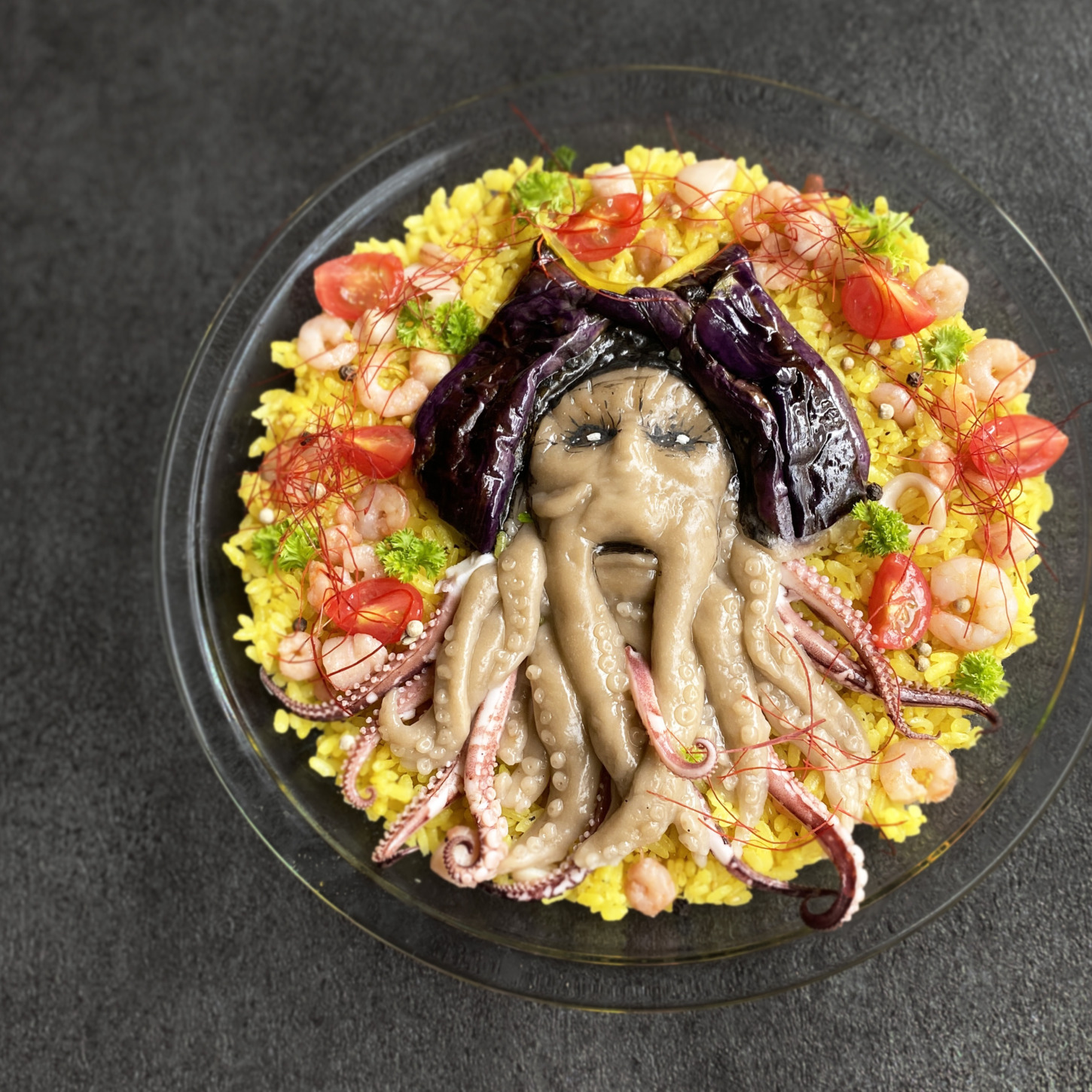 顔は白玉小麦粉団子とスルメイカのゲソ。