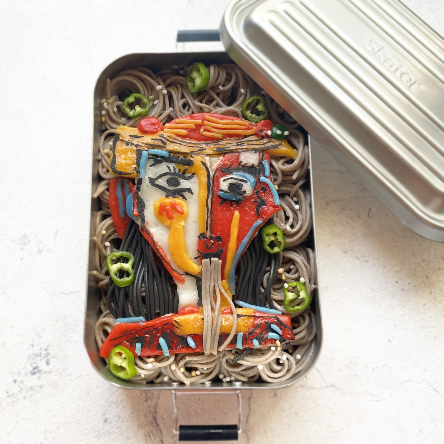 帽子をかぶった女がソバ食べている弁当を作りました。
