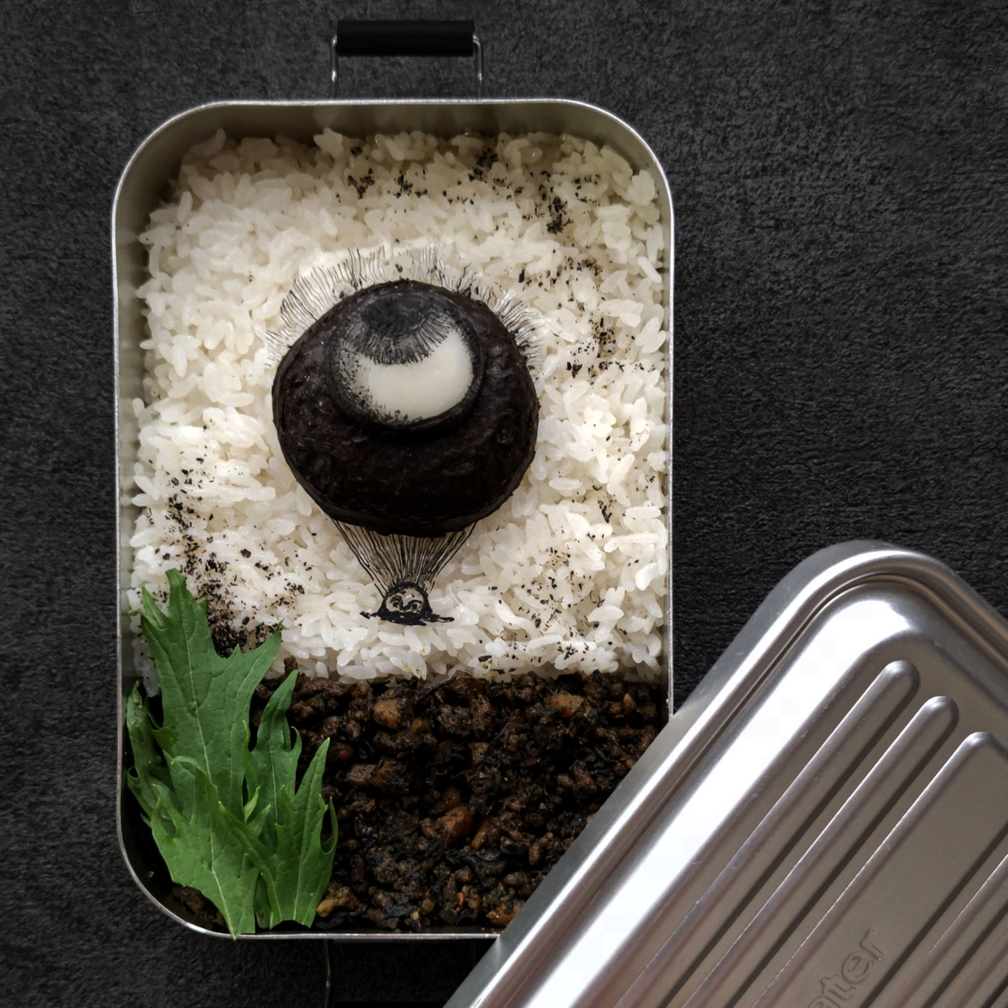 ルドンの眼球気球をモチーフにひじきカレー弁当を作りました。