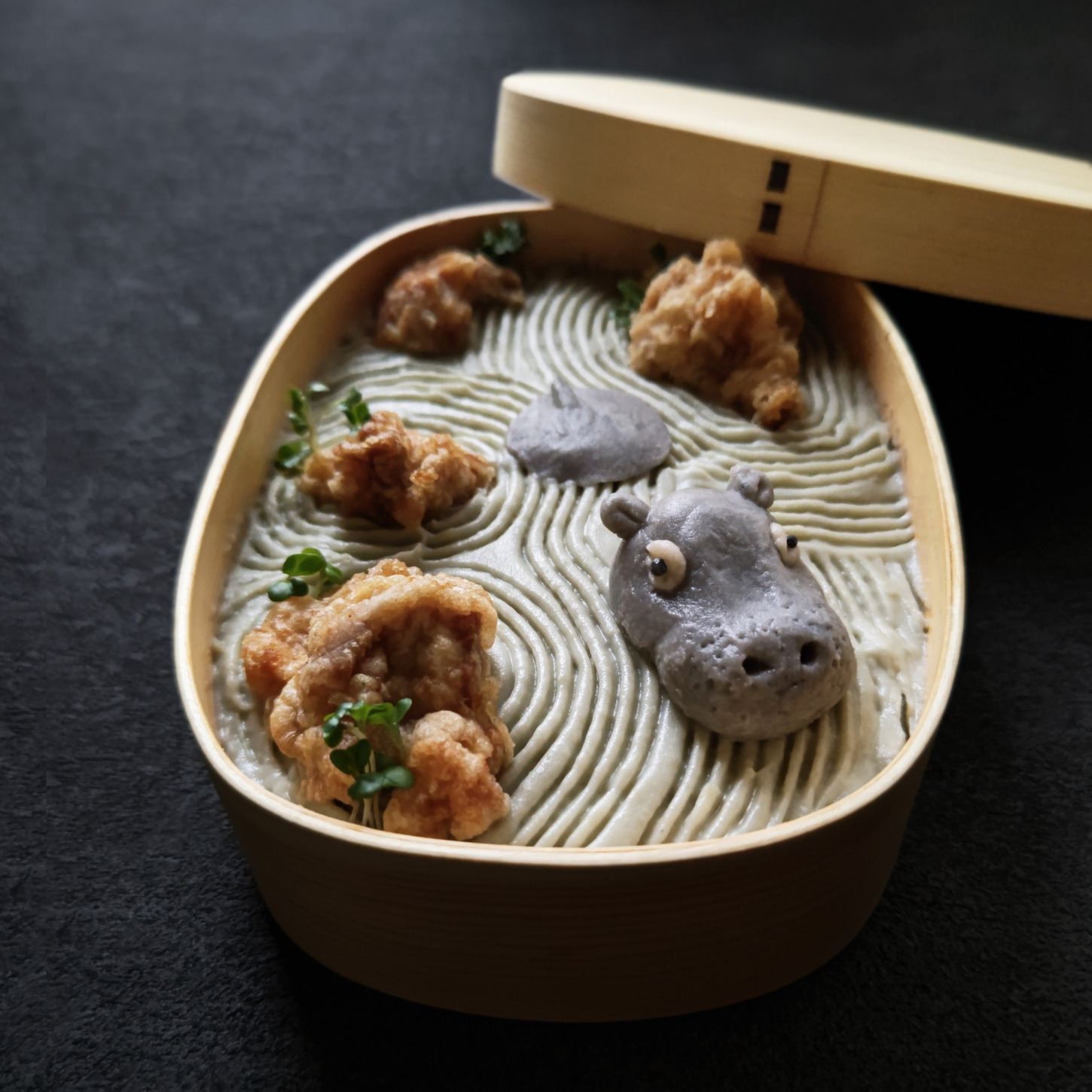 炒り卵と小松菜炒めを挟んだご飯が入っています。