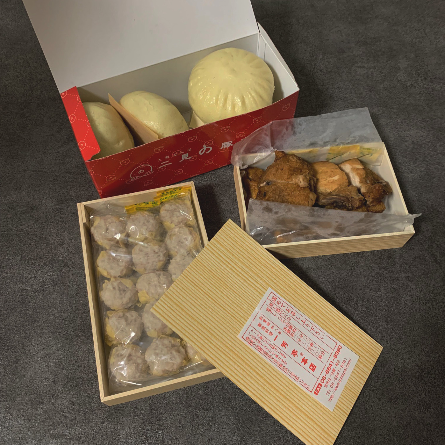 「二見の豚まん」と「一芳亭」のから揚げとシュウマイです。