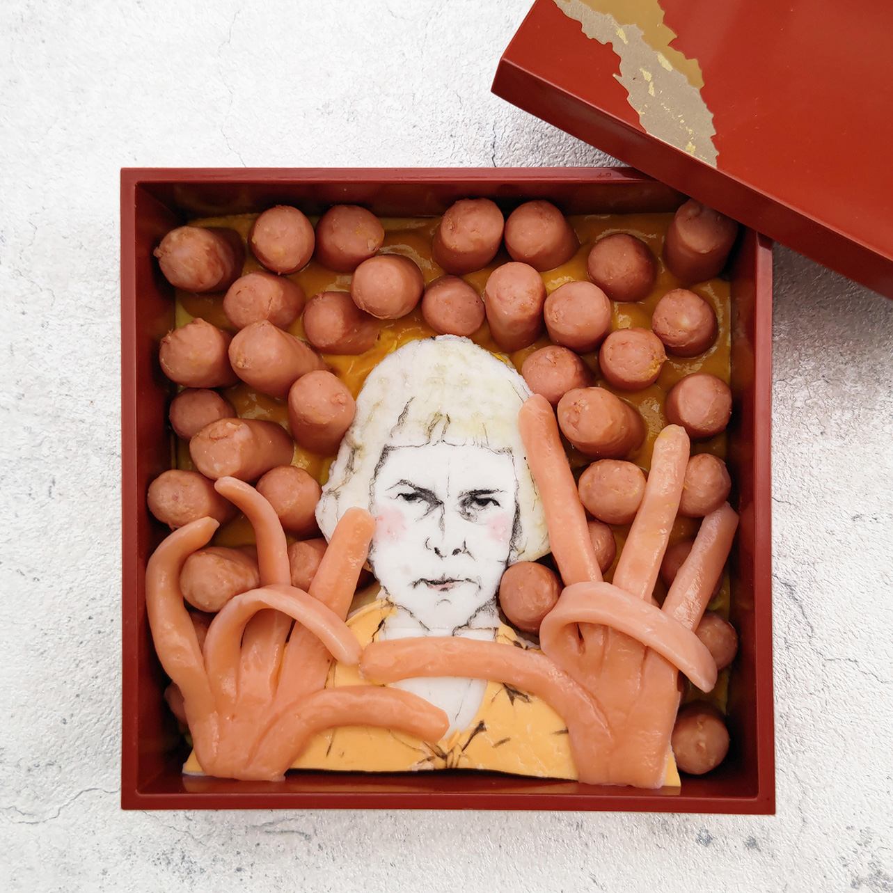 白玉小麦粉団子で作ったソーセージの手をのせます。
