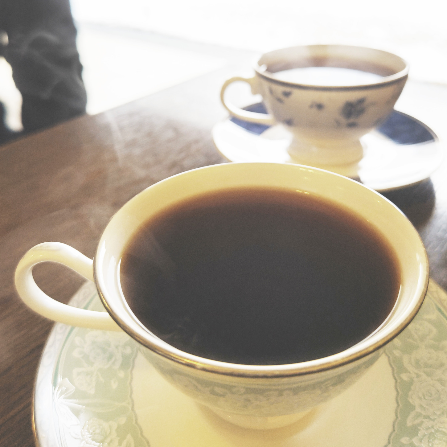 朝、時間調整で入った喫茶店で、なみなみと注がれたコーヒーの写真。