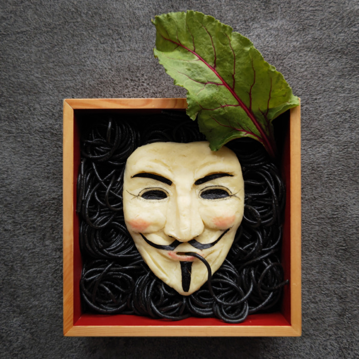 新シリーズお麺弁当でアノニマスのお面に麺を食べてもらいました。