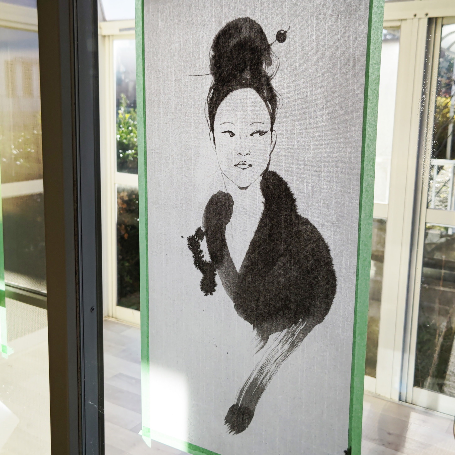 ガラスに貼り付けて四方をテープでとめて乾かします。